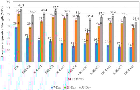 The RA concrete samples failed in the same manner as that of control samples in compression. The compressive strengths of all designed SCC mixes at curing ages of 7, 28 and 56 days are displayed in Figure 9. The incorporation of RAs as a full or partial replacement in SCC mixes has a substantial impact on the compressive strength of SCC mixes at different ages. The compressive strength of concrete is affected by several factors, including mix proportion, size, quality and RA replacement ratio. As illustrated in Figure 9, the 28-day compressive values of RA-SCC samples are lower than that of the control sample (CS) by 7–40%, depending on the replacement levels and screening times. The main reason for this is that the strength of RA is lower compared to NA because of the higher crushing values as described before. In general, RA experienced crushing during the retrieval process leads to a weaker ITZ between cement and aggregates within the concrete, resulting in a lower compressive strength [,]. The 7-day compressive strength results exhibited a negligible difference among the RA-SCC samples. As illustrated in Figure 9, the 7-day compressive strength of SCC mixes incorporating full and partial replacement of unscreened and screened RA declined linearly with increasing screening times. The strength development of RA-SCC mixes was observed to be higher at a later age.