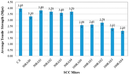 Figure 10 displays the tensile strength results of RA-SCC mixes at 28 days. As can be observed, the C.S sample displayed the highest tensile strength of nearly 4 MPa. The tensile strengths of samples with partial replacement of screened RA are generally higher than unscreened RA sample. In general, the tensile strength results follow a fairly similar trend to the compressive strength results. However, the effect of screening times on tensile strength is not significant. The tensile strengths of samples with full RA replacement are much lower than those with partial RA replacement. When the number of screenings applied was more than twice, the tensile properties tended to decline, similar to the compressive strength values. The SCC mixes of 100RAS0, 100RAS1 and 100RAS2 were roughly 35%, 34% and 30% lower than the C.S mix, respectively. It should be noticed that as the RA replacement levels increase, the number of air voids in the concrete matrix increase as well. This is the main reason the tensile strengths of samples with full replacement are lower than their counterparts with partial replacement. This is consistent with previous findings, which showed that the higher the RA replacement level, the lower the tensile strength. [,]. Based on the strength test results, it seems that screening up to two times is recommended as the tensile strength of the 100RAS2 sample was the highest when compared to the unscreened and screened samples with full RA replacement.