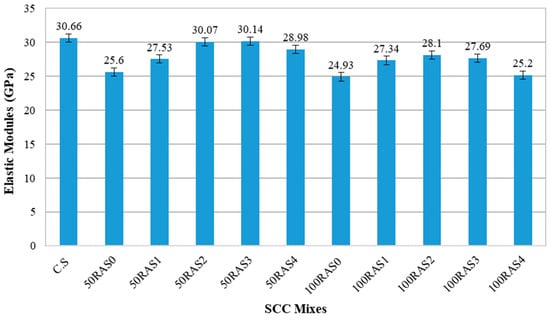 The stiffness of RA-SCC mixes was determined based on the modulus of elasticity. Several factors have been reported to have substantial contributions to the stiffness of concrete, including aggregate density and porosity, matrix, cement paste rigidity, and ITZ structure []. Figure 11 illustrates the elastic modulus results of RA-SCC mixes compared to the control (C.S mix). When compared to the control sample, all RA-SCC mixes had a lower elastic modulus. The main reason is due to the porous nature of RAs and their low concrete density as well as the weak relationship between old and new ITZs [,]. The elastic modulus of the RA-SCC mixtures with full RA replacement was lower than that of their partial replacement counterparts. The modulus of elasticity of RA-SCC decreases with the level of RA replacement, which is consistent with prior research results [,,,]. The elastic modulus of 50RAS2 is very close to that of C.S, and higher than those of 50RAS0 and 50RAS1 by 9% and 17%, respectively. The elastic modulus of 100RAS1 and 100RAS2 was around 10% and 13% higher than that of 100RAS0. Apparently, using mechanical screened RA can improve the elastic modulus behaviour of RA-SCC mixes. However, comparing between 100RAS2 and 100RAS4, a 10% drop in the elastic modulus observed when the screening increased from 2 to 4 times. Based on the mechanical test findings, it is clear that excessive screening can degrade RA and affect the strengths and elastic modulus, so it is advised that screening be performed no more than two times to gain the benefits of screening.