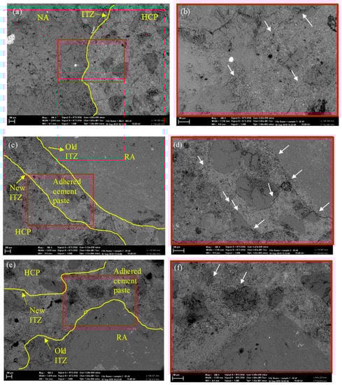 The SEM images of the 100RAS1, 100RAS2, 100RAS3, and 100RAS4 samples are shown in Figure 12e–l. As indicated by the arrows, minimal micro-cracks were found in the microstructure and ITZs of 100RAS1 and 100RAS2 samples when compared to the unscreened sample. In the 100RAS1 and 100RAS2 samples, the microcracks are predominantly single, with very little networking. The crack development through the attached old cement mortar is visible in the SEM images of the 100RAS3 (Figure 12i,j). However, the detected cracks were mostly single, with only a few cracks networking.