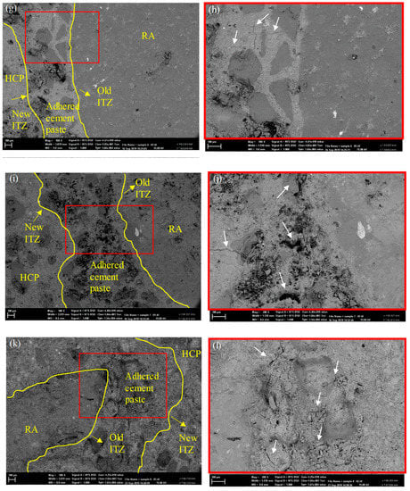 More microcracks can be seen on the adhered cement mortar of the 100RAS4 sample in Figure 12k,l. The existence of micro-cracks and pores and inadequate physical and chemical bonding between RA and cement paste indicate faults in the microstructure of RA, which decrease the mechanical capabilities []. The growth of microcracks in the 100RAS3 and 100RAS4 mixtures is a major contributor in lowering their physical and mechanical qualities, as proved in the previous sections. It can be revealed that increasing the screening time generates some microcracks along the old ITZs. Still, it does not significantly affect the SCC microstructure. In general, screening up to 2 times can improve the microstructure of ITZ.