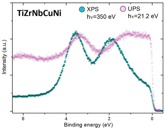 In this work, we present PES spectra obtained by 21.2 eV for UPS experiments and 350 eV (soft X-rays) for XPS experiments. In the amorphous HEA, the lack of long-range structural and compositional order is a suppressing factor for the band dispersion, as the electron momentum is ill-defined, and consequently, the intensity of PES spectra can only be qualitatively correlated to the total DOS. In polycrystalline samples, although the band dispersion is locally conserved, it cannot be resolved in standard photoemission experiments where the information is averaged over many different domains, and therefore blurred in k—space. However, one has to bear in mind that the transition probability to excite an electron from a certain element depends on photon energy [47] (see Figure 2). For example, the excitation of a Ti 3d electron is roughly 150 times more probable with a 21.2 eV than with a 350 eV photon [49]. Similarly, excitations from Nb and Zr 4d are more probable than from Cu 3d for 21.2 eV excitation energy. On the other hand, at 350 eV photon energy, the major contribution to photoemission intensity in the NbZrTiNiCu alloys spectrum comes from Ni and Cu [49]. In other words, the shape of the photoemission spectrum generally depends on the energy of an incoming photon.