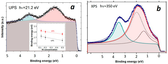 The preliminary study showed that at the edge of the glass-forming range, x = 0.5, RH of (TiZrNbCu)1−xNix MGs start to decrease [26], indicating the vicinity of xc. Since we were unable to obtain fully amorphous alloys with x > 0.5, here we show only how approaching the xc value affects the position and width of the maximum of the Ni d states studied with UPS and XPS (Figure 2 and Figure 5) (a recent finding that in (TiZrNbCu)1−xCox MGs, RH changes sign within their glass-forming range [74] provides a unique opportunity to study the band crossing in a chemically complex TE-TL MGs). To estimate the peak positions, the UPS and XPS spectra of (TiZrNbCu)0.5Ni0.5 (see Figure 5) were fitted using a Lorentzian line shape superimposed on the constant background terminated at the EB = 0 with Fermi-Dirac distribution. Notice that the spectral maximum at around 1.5 eV (see Figure 5b) related to the TiZrNbNi group was fitted with two Lorentzians reflecting the structure of the Ni-dominated [75] common band of TiZrNbNi. Note that both UPS and XPS spectra show that the Ni 3d peak shifts towards EF (or vice versa) with increasing Ni content from x = 0.125 to 0.5 (inset to Figure 5a). However, the positions of these peaks for the same x obtained from UPS or XPS measurements are not identical; peaks determined from XPS were found at 0.2 eV or higher binding energies when compared to UPS measurements (inset to Figure 5a). This difference, probably associated with an enhancement of the photoionization cross section of TEs at low photon energies, emphasizes the importance of performing both the XPS and UPS measurements when studying ES of TE-TL CCAs [28]. In the present case, where we want to find out how the contribution of the Ni d-state to the DOS at EF evolves with increasing x, the XPS measurements are preferred over UPS because they show in more detail the peak associated with Ni (Figure 5a and Figure 5b, respectively). From the small shift of EB towards EF of about 0.14 eV (less than 10% of initial EB throughout the explored concentration range) obtained from both UPS and XPS results (inset to Figure 5a), one may erroneously conclude that Ni d-states, even at x = 0.5, contribute only a little to the DOS at EF. However, an analysis of the evolution of the full width at the half maximum of a peak corresponding to d-states of Ni in the XPS spectrum with x shows that this width increases from about 1 eV for x = 0.125 to 1.62 eV or 62% at x = 0.5. Thus, the increase in the contribution of Ni d-states to N(EF) on increasing x in these alloys is largely due to the change in the width of the “Ni d band“ with increasing Ni content (the increase in the contribution of Ni d-states to N(EF) at elevated Ni contents was confirmed in LTSH measurements [11,26,27]). Thus, the studies of band crossing in TE-TL alloys should comprise XPS measurements. However, if subtle changes in N(EF) in alloying of the TE-containing alloys are to be studied, it is advantageous to use the enhanced photoionization cross section of TEs at low photon energies, as described in our next example.