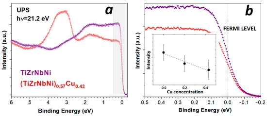 To single out the contributions of each TE (Ti, Zr and Nb) to N(EF) in our quinary MGs, one has to measure the LTSH of several MGs with different concentrations of each TE [28,78]. However, the study of photoemission intensity variation at EF, with Cu content in such alloys, can provide insight into the accuracy and energy resolution of the PES measurements used. This is illustrated in Figure 6a,b, in which we compare the UPS spectra for MGs with x = 0 and 0.43 (Figure 6a). Figure 6b clearly shows that the intensity decreases at EF with increasing x. Further, this decrease in intensity with Cu content is approximately linear (inset to Figure 6b), and the slope of this decrease is like that of the Sommerfeld coefficient (and thus also of N(EF)) obtained from the LTSH measurements of the same alloys (Figure 13 in [28]). This demonstrates the high quality and great usefulness of UPS measurements in correlating spectroscopic and specific heat results and in determining the intrinsic properties of these alloys.
