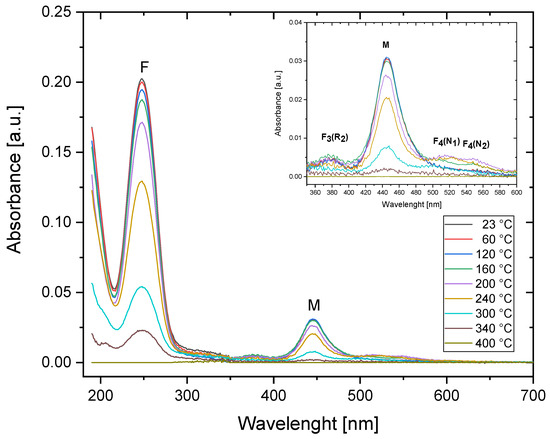 The series of absorption spectra measurements for Method 1 was conducted both for the sample irradiated with 30 kGy of Sr-90/Y-90 beta radiation and for the sample irradiated with Am-241 alpha particles with 3.4 × 1012 cm−2 fluence. The measured absorption spectra are presented in Figure 2 and Figure 3. The strongest bands are marked on the graphs with the names of the color centers that they originate from. For both types of radiation, the most prominent feature is the peak at a wavelength of around 250 nm, which is related to F centers. The M band, consisting of two overlapping bands related to the F2 and F3+ color centers, is visible around 445 nm. Peaks associated with other, more complex color centers are barely visible in the absorption spectra; therefore, they will not be discussed further.