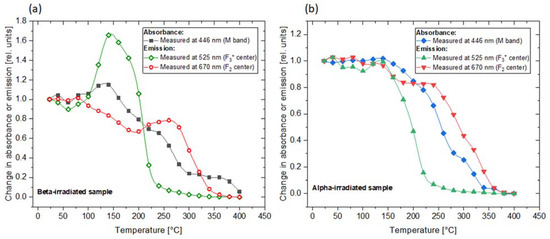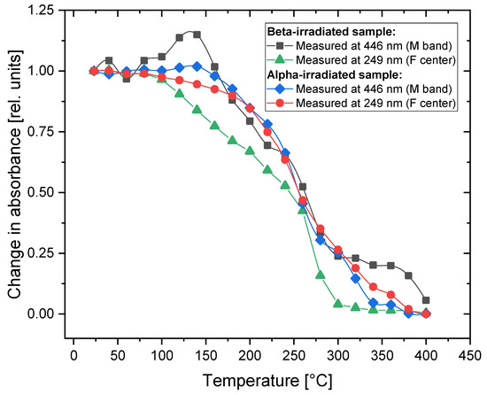 Relative changes in the absorbance measured for the wavelengths at which the maximum intensity of the M band (at 446 nm) and the peaks corresponding to the F centers (249 nm) were registered and are presented in Figure 4. Regarding the alpha-irradiated samples, no significant increase in absorbance was observed after applying Method 1. The absorbance levels measured for both F and M bands remains the same up to 150 °C but decrease in a similar manner above that temperature for both bands. The changes observed in the absorption spectra measured for the crystal irradiated with beta radiation are slightly different from those measured for the alpha-irradiated sample. There is a small increase in absorbance measured for the M band (at 446 nm) after heating at temperatures from 100 °C to 160 °C with the maximum at 140 °C. This temperature of the heat treatment agrees quite well with the annealing temperature after which the increase in the complex color centers’ concentration noticed by Dauletbekova et al. occurs [20]. In addition, the peak related to the F centers disappears faster for the beta-irradiated samples, and at a temperature of 300 °C, it can no longer be measured.