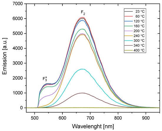 The photoluminescence emission spectra measured for the samples irradiated with the dose and particle fluence identical to those used for the absorption spectra measurements are presented in Figure 5 and Figure 6. Some differences can be seen between the spectra of the alpha- and beta-irradiated samples. First, for the samples measured without any additional heat treatment (marked on the graphs as 23 °C), the ratio of F3+ to F2 emission is higher for the alpha-irradiated sample (the ratio is 0.22) than for the sample irradiated with beta radiation (the ratio is 0.14). The reason may be similar to that deduced in the case of the absorption spectra: alpha particles deposit higher local doses, and a higher dose favors the creation of more complex centers. However, it is also possible that this difference is due to the fact that alpha particles deposit their energy only in a subsurface part of the sample. It has been reported that F3+ color centers are formed relatively more easily in the near-surface part of the crystal than in the bulk [31].