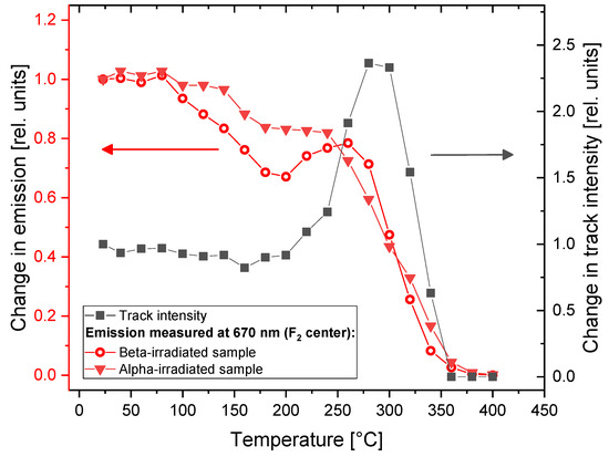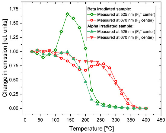 The emission related to the F2 centers decreases up to the temperature of 200 °C and this decrease is steeper for the beta-irradiated crystal. At higher temperatures, we observe an increase in PL emission at 670 nm for the beta-irradiated sample, leading to a local maximum at 270 °C. For the alpha-irradiated sample, there is a kind of plateau in a similar temperature range. Above the temperature of 350 °C, the PL intensity reaches zero for both samples.