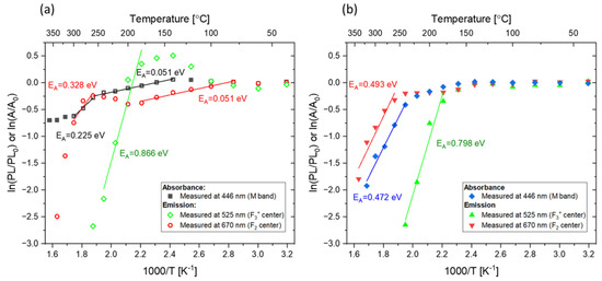 An Arrhenius analysis was performed for the data presented in Figure 8. The relationships and were assumed, where and are PL intensity and absorbance, respectively, before heat treatment; is the activation energy; and is the temperature in Kelvins. In the graphs presented in Figure 9, the slopes that can be expressed by a single exponent have been fitted to the experimental data and the activation energies have been calculated. It can be seen that while for the alpha-irradiated sample we observe a steady decrease in both absorbance and PL intensity, for the beta-irradiated sample, a more complex behavior is present. In both cases, however, the activation energies related to the decrease in F2 PL intensity and M-band absorbance for the heating procedure at temperatures exceeding 250 °C are similar. This can be explained by the lack of F3+ centers, which disappear at much lower temperatures than F2 centers. For that reason, after the heat treatment at high temperatures, the absorbance of the M band is exclusively connected to the F2 centers.