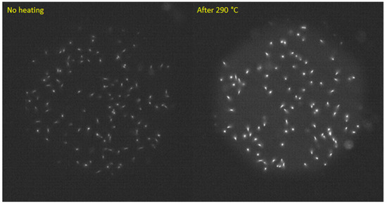 As mentioned in Section 1, the main motivation for which the present study was undertaken was the observed increase in the intensity of the fluorescent nuclear tracks after heating the LiF crystals [26]. This effect occurs after the treatments at temperatures between 200 °C and 300 °C and reaches the maximum of a 2.5-fold increase in track intensity at 290 °C. In Figure 10, the microscopic images of an alpha-irradiated sample before and after heat treatment at 290 °C are presented. The tracks in Figure 10 were registered with a long-pass filter ET570lp (red emission). We were not able to observe any tracks before or after heat treatment while using a bandpass filter HQ 535/30 (green emission). This means that for small doses of alpha radiation, there is no increase in the signal in the green part of the PL spectrum or this increase is not large enough to make tracks visible even while using long acquisition times.