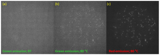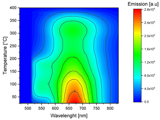 - Method 2—PL emission spectra were measured while raising the temperature at a linear ramp. The heating stage was mounted into the setup of the fluorescence microscope. The sample was placed at the stage at RT. Then, the heat was turned on, and the sample was heated to 400 °C with a heating rate of 50 °C/min. At the same time that the heating procedure was employed, the sample was illuminated with 440 nm light and emission spectra were registered every 2 s.