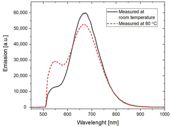 A different situation can be observed for the case of the emission peak at 525 nm, which is related to F3+ color centers. For this wavelength range, there is a clear increase in PL emission for temperatures from around 50 °C to 200 °C in comparison to the room temperature (RT) measurements. The PL spectra measured for the alpha-irradiated sample at room temperature and at 80 °C are compared in Figure 14. By comparing these two spectra, we can clearly see the increase in photoluminescence measured for the wavelength corresponding with the F3+ color centers (around 525 nm). A small decrease in the photoluminescence measured for a peak with a maximum at 670 nm is also present. Similar behavior was also observed for the beta-irradiated sample.