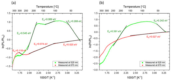 Arrhenius analysis of the changes in PL intensity with respect to the values at room temperature measured while heating the sample (the sample submitted to Method 2). Measured for: (a) the sample irradiated with 8 kGy of beta radiation from the Sr-90/Y-90 source and (b) the sample irradiated with alpha particles from the Am-241 source (fluence 1012 cm−2). All data are normalized to the respective values measured at RT.