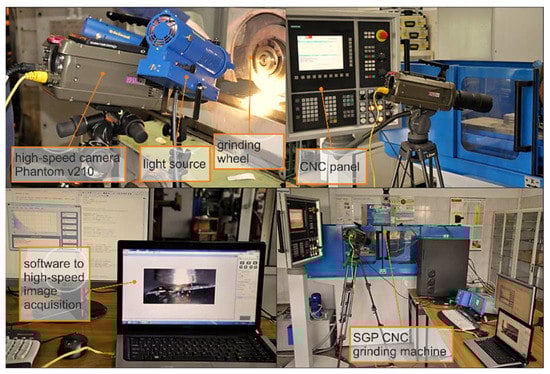 Increasing the coefficient of friction between the grain and the workpiece material expands the dead zone. Cutting under such conditions is easier and more similar to chip cutting, as the specific energy decreases resulting in lower temperature increments, which is conducive to reducing tensile stress values in the surface layer, although the micro-cutting process may be less stable. Cutting with a wide edge parallel to the machined surface and located perpendicular to the direction of the main movement, extends the path of lateral material displacement, which makes it more difficult to form pile-ups and favourably reduces the ratio of the volume of lateral ridges to the volume of material removed [,]. A concave, or flat, grain face is preferable to a convex one in terms of its ability to separate material. Most clearly, these factors become apparent during micro-cutting with monocrystalline silicon carbide grains, which not only have small corner radii, but also have a flat contact surface and form wide microcracks. Cutting with an edge parallel to the work surface and approximately perpendicular to the direction of the edge movement is advantageous, especially when machining materials with high plasticity. It is then possible to reduce the ratio of the volume of the lateral ridges to the volume of the material being removed. In experimental studies of abrasive machining processes, a high-speed image acquisition station (Figure 5) can be useful, when equipped with a camera that allows recording up to several hundred thousand frames per second with additional high-brightness spot lighting.