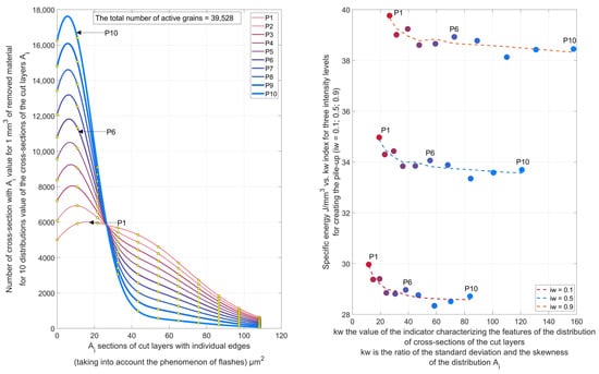 The topography of the active surface of an abrasive wheel with certain characteristics affects not only the geometric structure of the ground surface and the intensity of grain chipping, especially at the initial stage of the life, but also the specific energy of machining (Figure 6). A high value of the skewness coefficient of the cross-sectional distribution of the machined layers occurs when the radii of the action of the tops of the active grains vary significantly. This occurs as a result of coarse shaping of the active surface of the tool. As a result of machining, the height of asperities of the machined surface is then excessive, but the unit energy of machining is reduced. The feed speed during grinding with coolant feed has a significant effect on the process energy and temperature field (Figure 7).