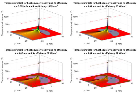 Temperature field during grinding of flat components made of construction steel for different speeds of heat source and speed-dependent heat source efficiency.