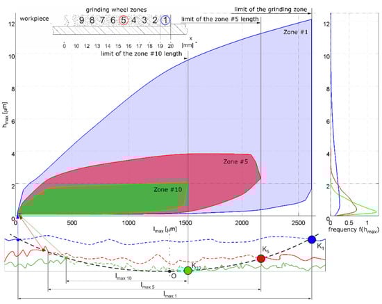 The random component depends most heavily on the wear of the grinding wheel and random causes of kinematic inaccuracy of the technological system, with the distribution of the random component approximating a log-normal distribution. In process modelling and simulation, when a random number generator is needed, one of the model distributions is usually chosen, which can cause errors when data from real processes indicate an unusual form, such as multimodal. The probability of contact between the grains on the surface of an abrasive tool and the material of a workpiece with a specific surface topography depends on the statistical characteristics of the distributions of grain vertices and ordinates of the machined surface [], the thickness of the layer to be removed, the kinematic characteristics of the process and the susceptibility of the tool (Figure 2). The probability of contact between the edges and the workpiece decreases as successive zones of the grinding wheel surface move over the surface already machined by the zones preceding them. The smaller the thickness of the layer being ground, the lower the probability of contact between the grains and the workpiece. In the case of abrasive tools with higher susceptibility (such as abrasive films and grinding wheels with susceptible bonds), the recesses of the grains are smaller, and the probability of contact decreases to a lesser extent with the passage of machining time. The modelled abrasive machining processes are not stationary processes. Errors resulting from the assumption of stationarity of the processes depend on the starting point and the period of data collection. The aggregate distribution differs from the instantaneous distribution the more the longer the total collection period is and the less stable the systematic components are. These components can cause an increase in the variance of the summary distribution, a change in the asymmetry coefficient and a change in the flattening coefficient. The instability of the random components, on the other hand, causes a change in the form of the distribution.