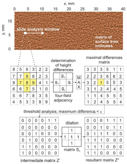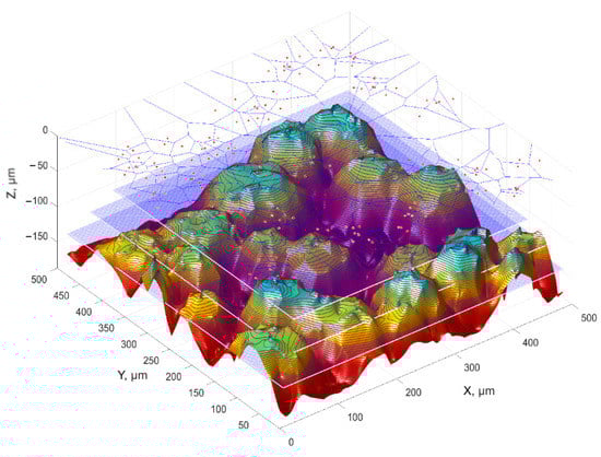 Measuring the surface topography of abrasive tools is possible, for example, using a laser scanning confocal microscope LEXT OLS 4000 (Olympus Co., Tokyo, Japan), but the limitation is the maximum height of the object being measured. It becomes necessary to use replicas of the surfaces under study [] with a previously conducted assessment of the accuracy of the surface reproduction. Specialised materials and instrumentation providing a mapping resolution of 0.1 µm can be used to make replicas of the active surface. In order to extract fragments of the corners of abrasive grains, the watershed segmentation algorithm is useful for separating larger objects into smaller ones. This method can extract grains quite well, but may not distinguish as separate two close vertices of similar height belonging to different grains. It is then possible to apply the vertex extraction procedures first and then use the results of the watershed segmentation algorithm [].
