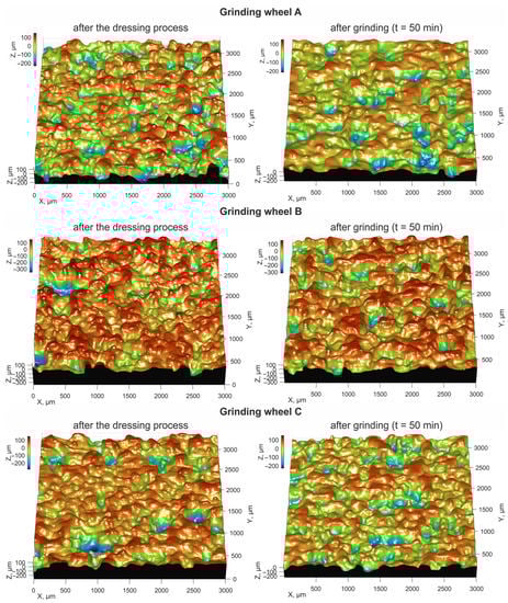 Images of the surface topography of the tested grinding wheels after the dressing process and after 50 min of grinding.