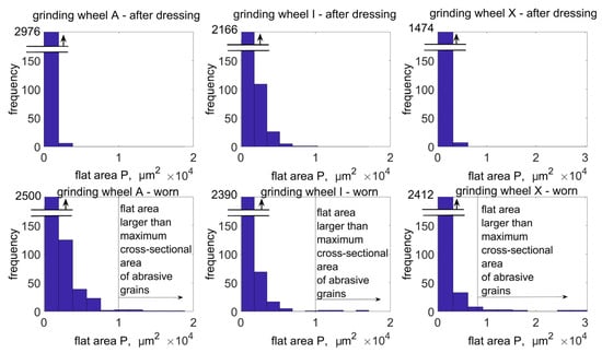 Histograms of Pi areas of flat areas identified on the active surface of the tested grinding wheels.