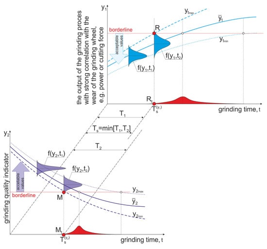 This means that the life of the grinding wheel Ts is equal to the sum of the times of grinding operations after which at least one of the process characteristics or characteristics describing the results of the process reaches the limiting value (Figure 16). The magnitudes yj, on which the limiting conditions are imposed, depend on the grinding parameters xi, the grinding wheel operation time t since the last shaping of its active surface and interferences z, the number and impacts of which are unknown. From the limiting conditions: