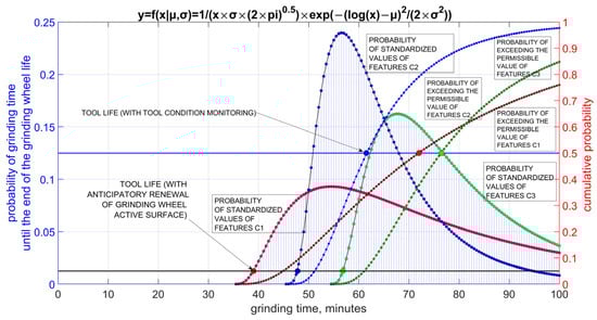 During supervision, it is checked whether the values of the monitored features are exceeded, and then statistically the life corresponds to the average value from all realisations. Durability distributions that were determined taking into account each characteristic separately will, of course, differ in expected value and variance. Most often, it can be assumed that the form of the distribution, as a result of the multiplicative mechanism of cumulative influence of factors affecting changes in individual features, will be close to a log-normal distribution. From the above observations, it can be seen that under machining conditions in which the condition of the tool and the process features are monitored, in successive periods of use of the grinding wheel, the service life may be determined by various limiting conditions, but the average service life will be at a level significantly higher than that corresponding to the anticipatory renewal of the active surface of the tool.