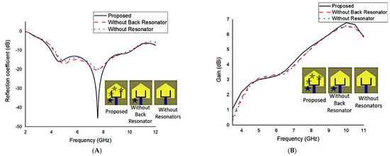 The parasitic resonator’s effects on the reflection coefficient (A) and the gain (B).