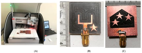 To test the results of numerical analysis, a prototype of the simulated antenna is built utilizing a CNC-based PCB device (Figure 5A). The S11 value is determined by using VNA. Figure 5B–D shows the fabricated prototype and measuring system.