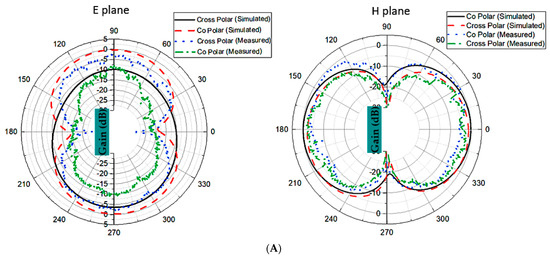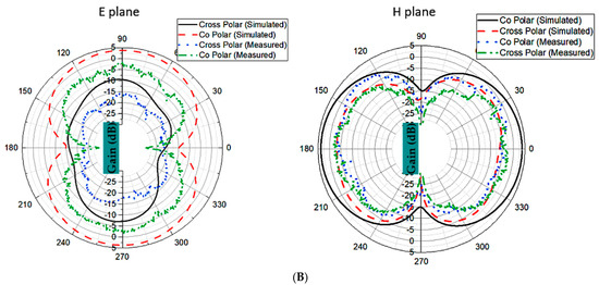 Figure 7A,B displays the E and H planes in two different planes, as well as co- and cross-polarization for two frequencies of 4.5 GHz and 7.5 GHz. The antenna transmits electromagnetic waves omnidirectionally in the E and H planes, as shown in Figure 7. At a low frequency of 4.55 GHz, radiation patterns with co-polarization of the E plane are slightly directed.