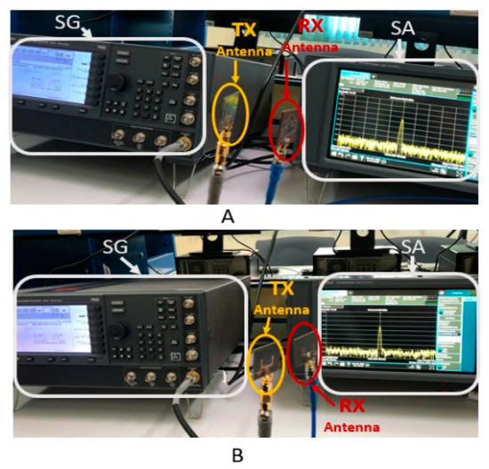 Signal generator transmitting to spectrum analyzer via TX and RX antennae (A) for FtF and (B) for SbS scenarios.
