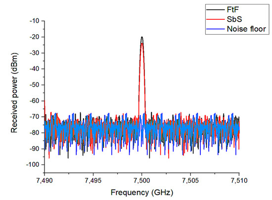 The frequency response of a 13 dBm pulsed CW RF signal irradiated by the SG at 7.5 GHz is shown in Figure 9. The frequency-domain response shows a noise floor of roughly −77 dBm without the SG pulse signal. Since the signals are affected by the environment in the case of tests carried out in free space, after the pulse, the received signals of −19.8 dBm and −23.8 dBm are measured for FtR and SbS, respectively.