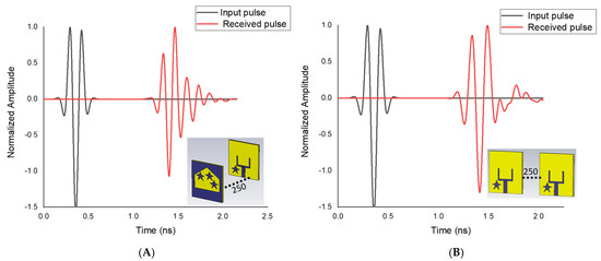 Figure 11A,B demonstrates the incident and transmitted waves propagating along two orientations with a length of 250 mm between the two suggested radiators. TX and RX signal values show that orientation of FtF and SbS have low reduction of transmitted signals.