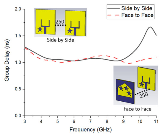 It must be mentioned that the group delay is numerically analyzed for both types of orientation in the case of 250 mm distance between the antennae. The change in group delay throughout the entire operating band is below ±2.0 ns [20], which can be defined as an acceptable value for MWI studies. The figure of the group delay for face orientation is nearly linearly distributed, which acts to transmit short waves to the antenna with lower late-time ringing and distortion. Hence, it is proposed to utilize the suggested antenna in an FtF orientation.