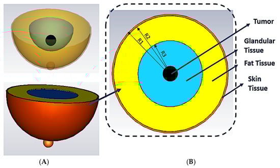 The design of the three-layered heterogeneous breast phantom model is shown in Figure 14. Figure 14A shows the simulated breast phantom model for analysis. Furthermore, in both simulation and fabrication, a tumor with a diameter of 10 mm is examined. Figure 14B displays a breast model with R1 = 50 mm, R2 = 48 mm, and R3 = 30 mm with a height of 30 mm.