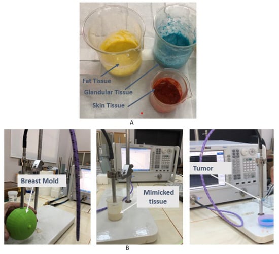 (A) The fabricated breast tissue components and (B) breast phantom dielectric measurement.