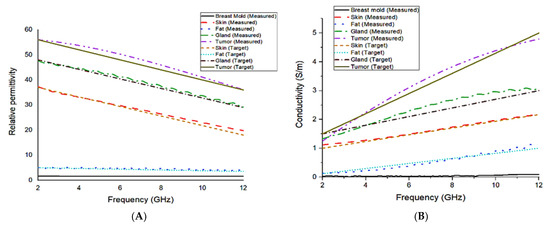 (A) Measured and compared relative permittivity and (B) measured and compared conductivity.