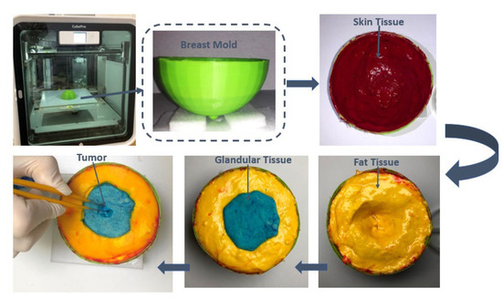 As shown in Table 2, there is a similar preparation phase for each tissue type in the breast phantom, with varied material concentrations. This section shows a 3D-printed breast phantom created from the anatomy of a genuine human breast using the CubePro Trio 3D printer.