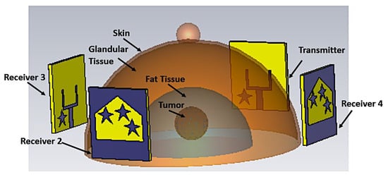 The proposed antenna will be employed as a radiating element in an MWI-based breast cancer detection system. Figure 19 depicts a configuration of four antennae surrounding a breast model for testing antenna performance in an imaging system.