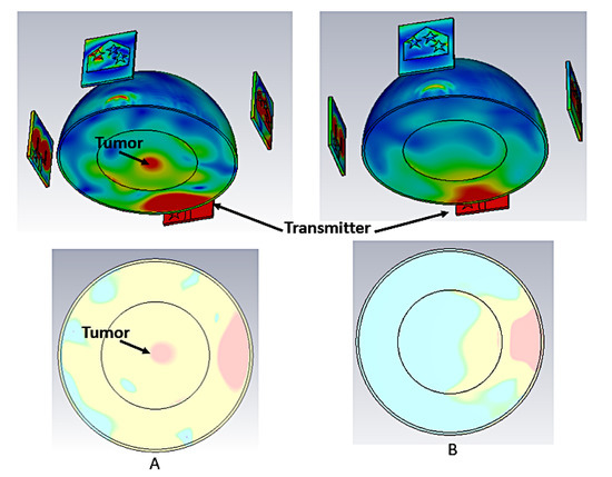 Figure 20 depicts simulated imaging results of the electric field of the prototype, shown in Figure 19, for breasts with and without tumors to better comprehend the changes in signal scattering. Antenna 1 is the only one that emits radiation in this scenario. In fact, microwaves behave differently when they come into interface with tissue with differing dielectric properties. The signal scattering percentage inside normal tissue is larger than that of tumor cells, because in comparison to normal breast tissue, tumor cells have higher dielectric properties. As a result, the tumor cell reflects more signal. The scatter signals from the breast tissue and the malignant tissue also show a significant difference in the imaging results. Additionally, a high-resolution image that shows the location of the tumor cell has been highlighted in red.