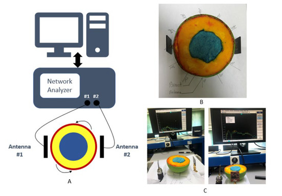 (A) The antennae surrounding the breast in this study’s data acquisition setup experiment, (B) photograph of the setup, and (C) sample of backscattering data measurements.
