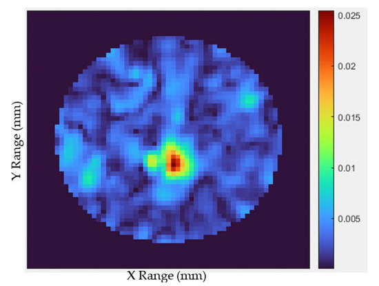 Figure 22 shows the revised image depending on the experimental study, with the high-contrast zone representing the tumor’s center. The tumor object has been clearly identified with red, as can be seen. However, the malignancy appeared somewhat off-center on the image compared to its actual location. This suggests that our technique could be a promising candidate for microwave imaging in order to detect undesired cell-like tumors by efficiently evaluating backscattering signals.