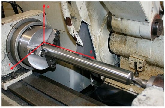 The errors in the longitudinal section of the workpiece that occur during machining are caused by the low and uneven stiffness of the technological system, the main elements of which are the workpiece, the centers in which it is mounted, and the cutting tool [27,28,29,30]. The compliance (flexibility) of such a system can be altered by changing the stiffness of the centers or increasing the stiffness of the part in the machining process, for example, as a result of applying the appropriately defined bending moments [31,32,33,34].