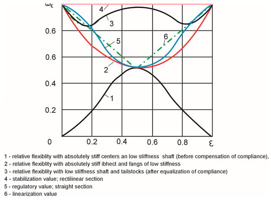 Stabilization can be achieved by adjusting the rigidity of the centers so that the elastic technological system’s compliance does not change according to curve two, but according to curve five (Figure 2). Then, curve five will represent the adjustment that ensures the stability of the compliance over the length of treatment ω4 = const. Curve five can be calculated using the following equation [38]: