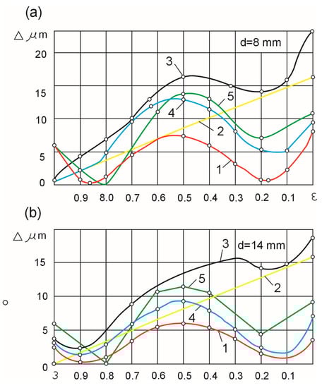 Shaft cylindricity errors when regulating the compliance of the investigated technological system (horizontal axis ε = x/L): (a) for d = 8 mm, (b) for d = 14 mm.