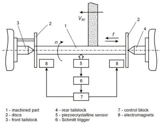 The abrasive machining of low-stiffness shafts was carried out on a station which allows for the controlling of bending moments. A block diagram of the station is shown in Figure 6, and the operational characteristics of the station are presented in [27].