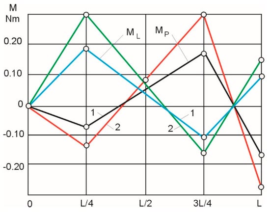 Linearized values of the control moments on the left (Ml) and right (Mp) stops: 1—for samples with d = 8 mm; 2—for samples with d = 14 mm.