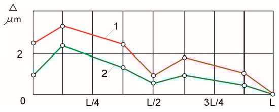 When the compliance is adjusted by a targeted increase in the compliance of the centers and there are no geometrical inaccuracies of the machine tool, the compliance of the two centers should be identical: for samples with diameters d = 8 mm and d = 14 mm, 4 µm/ N and 2 μm/N, respectively. Curve 1 in Figure 5 shows the theoretical deviation of the shape of the workpiece when the compliance of the technological system is adjusted.