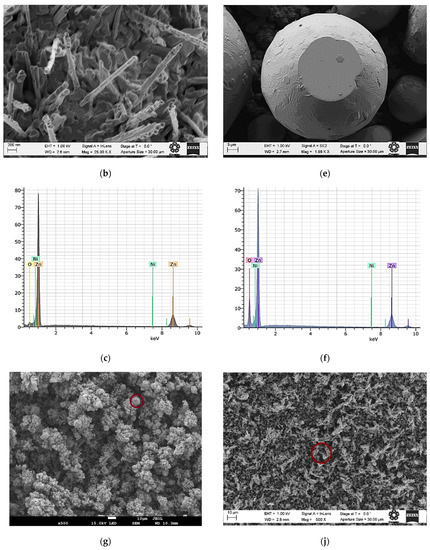 Figure 5g shows the micrograph of the A3 sample, where agglomerates with a rough surface are observed growly arbitrarily. In the magnification of Figure 5e, a structure with smooth hexagonal faces was observed; an EDS of the structure is presented in Figure 5i. There was no Ni present in this sample; according to XRD and EDS, the material was almost Zn with a low percentage of ZnO. We propose that ZnO droplets start to nuclei, forming agglomerates. These agglomerates are the precursors of the morphology obtained when the deposit temperature was increased to 400 (sample A2).