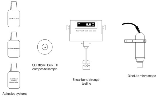 After the storage time of two months, half of the samples were loaded into a bond strength testing machine Ultra Tester (Ultradent Products, South Jordan, UT, USA) and tested into a macro shear mode. The machine was set to operate at a 1 mm/min crosshead speed until bond failure occurred. The second subgroup of samples was tested following the thermal cycling process. The shear bond strength values of the adhesives to dentin were regulated in accordance with ISO 29022 [28]. The fractured fragments were examined with a 3.6× optical loupe (Carl Zeiss Meditec AG, Oberkochen, Germany) and DinoLite microscope (DinoLite, Almere, The Netherlands) to determine the type of fracture, i.e., the cause of failure. If the fracture line is between the tooth and the composite cylinder, the fracture mode is classified as adhesive. The fracture mode is classified as mixed if the fracture line runs partially along the adhesive interface and penetrates one of the substrates, so we distinguish between the mixed fracture mode in the dentin or in the composite (depending on which substrate it covers). If more than 75% of the adhesive area involves either dentin or composite, the fracture mode is classified as cohesive. Surface morphology was examined by three examiners (E.K., A.I., and S.J.K) using different magnifications up to 200 magnification and photomicrographs of representative areas were taken. Figure 2 provides an illustration of the experimental research program.