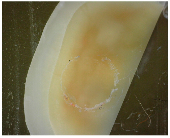 No significant differences were found between fracture types. All fractures, i.e., fracture lines, were located between the tooth and the composite cylinder, so the fracture mode was classified as adhesive (Figure 4 and Figure 5). None of the speciments were classified as mixed or cohesive.